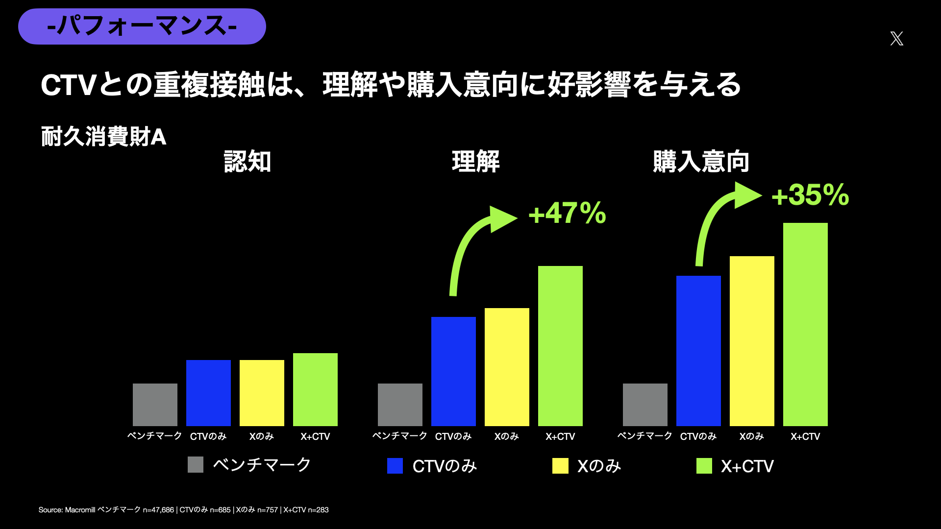CTVのみと比較しても同様、Xプレロール広告を併用することで商品理解、購入意向という深い指標において更なるリフトが確認されました。